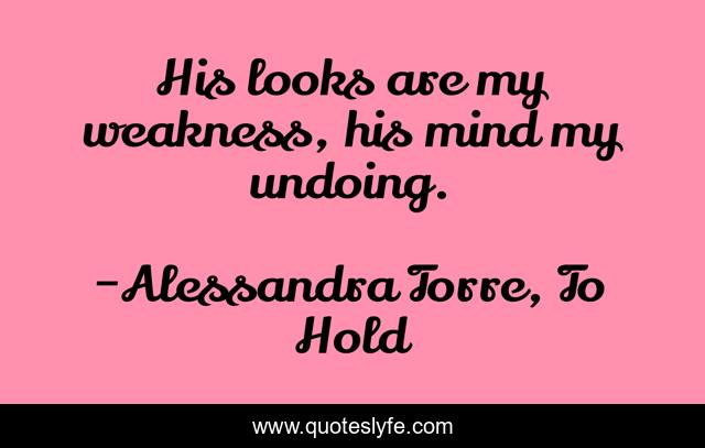 This page presents the quote "His looks are my weakness, his mind my undoing.". Author of this quote is Alessandra Torre, To Hold. This quote is about love, pulls-you-in, weakness, lust, attraction, mind-control, affection,.
