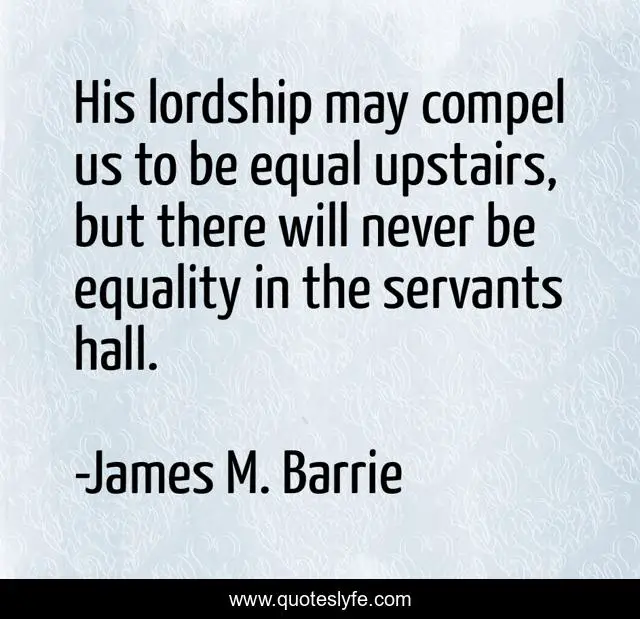 This page presents the quote "His lordship may compel us to be equal upstairs, but there will never be equality in the servants hall.". Author of this quote is James M. Barrie. This quote is about may, equal,.