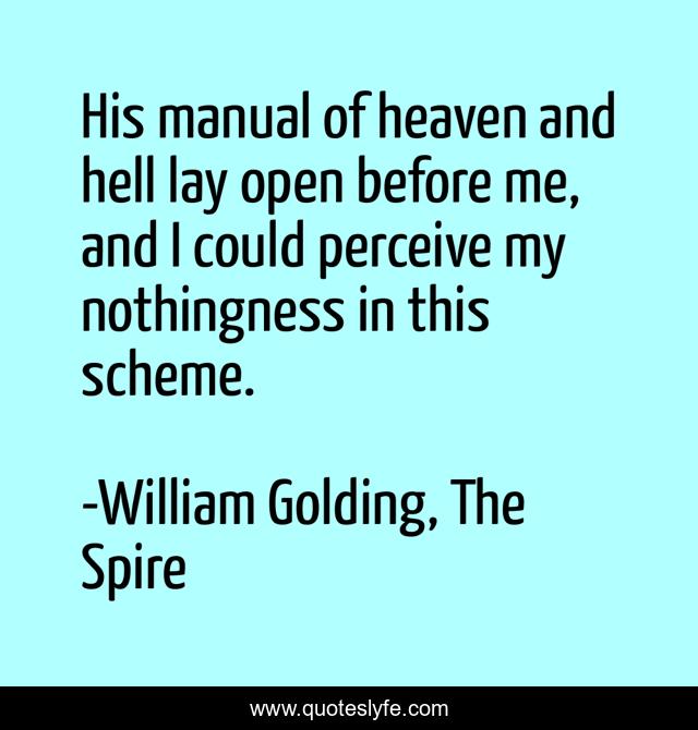 This page presents the quote "His manual of heaven and hell lay open before me, and I could perceive my nothingness in this scheme.". Author of this quote is William Golding, The Spire. This quote is about heaven, god, nothingness, hell, insignificance, humanity,.