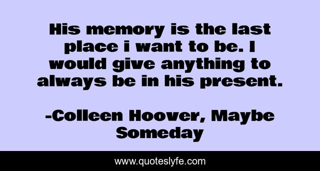This page presents the quote "His memory is the last place i want to be. I would give anything to always be in his present.". Author of this quote is Colleen Hoover, Maybe Someday. This quote is about relationships, romance, love, affection, sweet-talk,.