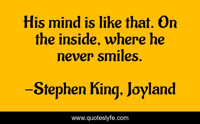 This page presents the quote "His mind is like that. On the inside, where he never smiles.". Author of this quote is Stephen King, Joyland. This quote is about joyland, novel, crime,.