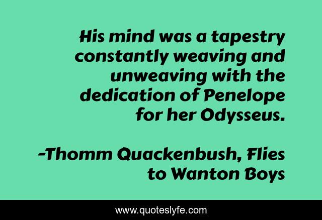 This page presents the quote "His mind was a tapestry constantly weaving and unweaving with the dedication of Penelope for her Odysseus.". Author of this quote is Thomm Quackenbush, Flies to Wanton Boys. This quote is about love, mind, affection, weaving,.