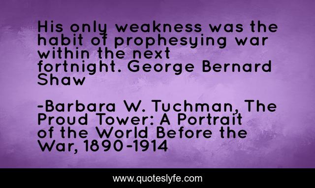 This page presents the quote "His only weakness was the habit of prophesying war within the next fortnight. George Bernard Shaw". Author of this quote is Barbara W. Tuchman, The Proud Tower: A Portrait of the World Before the War, 1890-1914. This quote is about communication, conspiracy, tone, word-choice,.