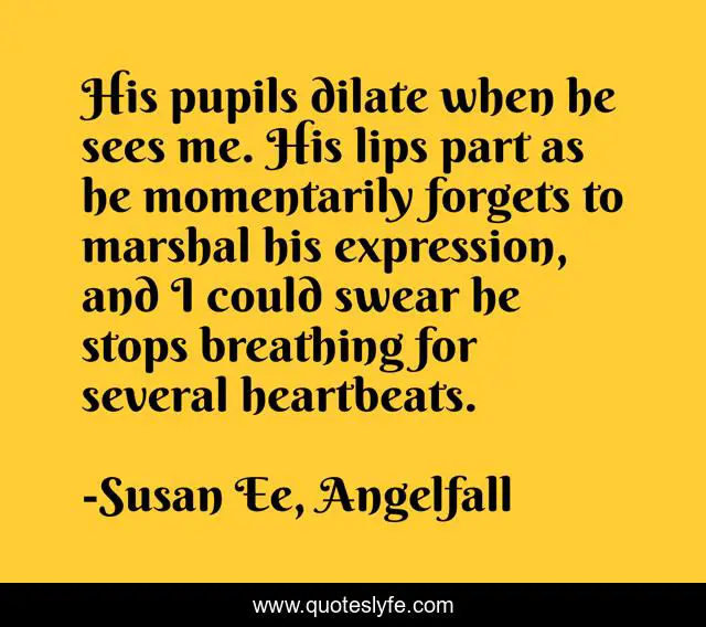 This page presents the quote "His pupils dilate when he sees me. His lips part as he momentarily forgets to marshal his expression, and I could swear he stops breathing for several heartbeats.". Author of this quote is Susan Ee, Angelfall. .