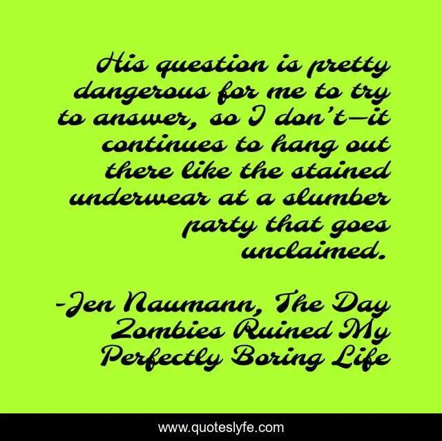 This page presents the quote "His question is pretty dangerous for me to try to answer, so I don’t—it continues to hang out there like the stained underwear at a slumber party that goes unclaimed.". Author of this quote is Jen Naumann, The Day Zombies Ruined My Perfectly Boring Life. This quote is about humorous, ya, young-adult-fiction, humor, zombies,.