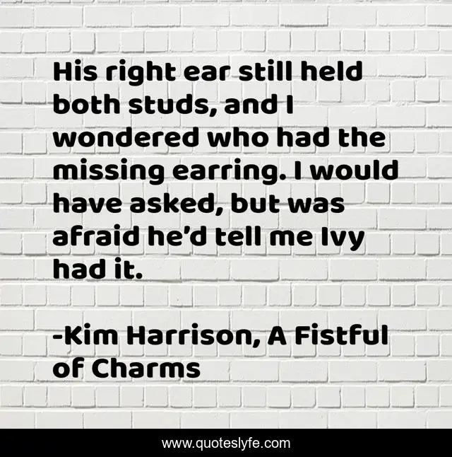 This page presents the quote "His right ear still held both studs, and I wondered who had the missing earring. I would have asked, but was afraid he’d tell me Ivy had it.". Author of this quote is Kim Harrison, A Fistful of Charms. This quote is about kisten, vampire, fiction, romance, supernatural, rachel-morgan,.