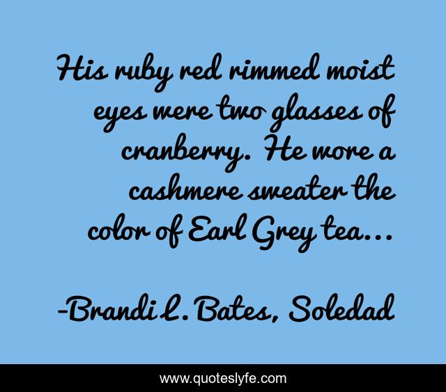 This page presents the quote "His ruby red rimmed moist eyes were two glasses of cranberry. He wore a cashmere sweater the color of Earl Grey tea...". Author of this quote is Brandi L. Bates, Soledad. This quote is about life, love, soledad-francis, brandi-bates, albert-einstein-life, success, wisdom, truth-to-power, affection,.