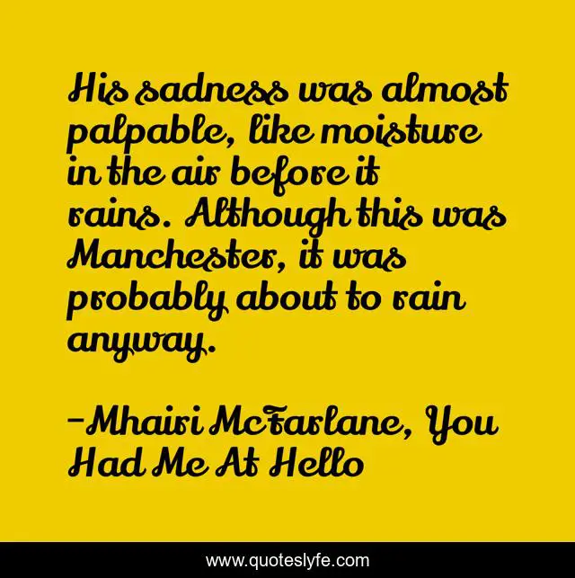 This page presents the quote "His sadness was almost palpable, like moisture in the air before it rains. Although this was Manchester, it was probably about to rain anyway.". Author of this quote is Mhairi McFarlane, You Had Me At Hello. This quote is about manchester, rain,.