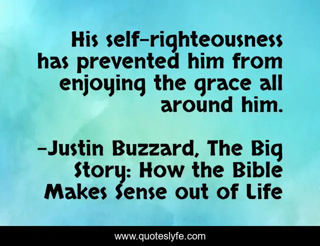 This page presents the quote "His self-righteousness has prevented him from enjoying the grace all around him.". Author of this quote is Justin Buzzard, The Big Story: How the Bible Makes Sense out of Life. This quote is about self-righteousness, grace, jesus,.