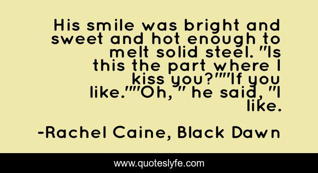 This page presents the quote "His smile was bright and sweet and hot enough to melt solid steel. "Is this the part where I kiss you?""If you like.""Oh, " he said, "I like.". Author of this quote is Rachel Caine, Black Dawn. This quote is about eve-rosser, rachel-caine, kiss, sweet, the-morganville-vampires, michael-glass, black-dawn,.