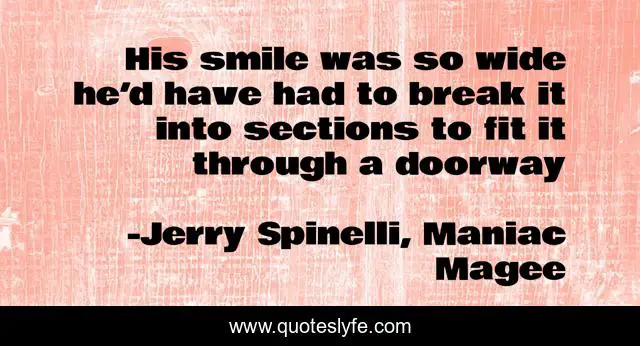 "Jerry Spinelli, Maniac Magee Quotes." Quoteslyfe.com, 2025. Mon. 08 Dec. 2025. <https://www.quoteslyfe.com/quote/His-smile-was-so-wide-he-d-243667>.