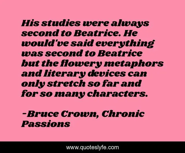 This page presents the quote "His studies were always second to Beatrice. He would've said everything was second to Beatrice but the flowery metaphors and literary devices can only stretch so far and for so many characters.". Author of this quote is Bruce Crown, Chronic Passions. This quote is about love, metaphor, ethereal, affection,.