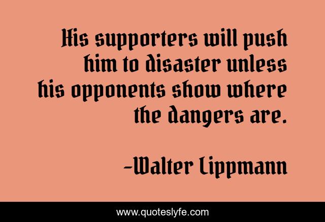This page presents the quote "His supporters will push him to disaster unless his opponents show where the dangers are.". Author of this quote is Walter Lippmann. This quote is about support, pushing, leadership, opposition, politics, opponents,.
