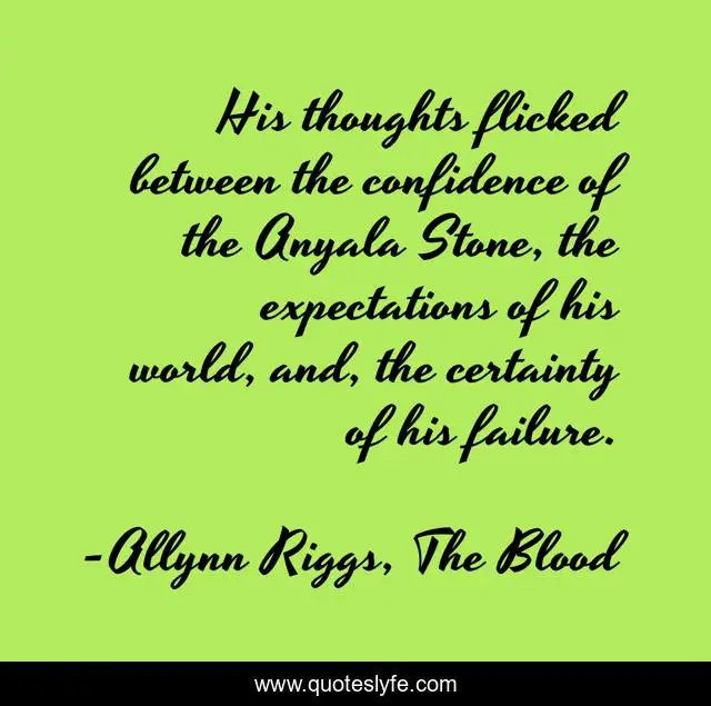 This page presents the quote "His thoughts flicked between the confidence of the Anyala Stone, the expectations of his world, and, the certainty of his failure.". Author of this quote is Allynn Riggs, The Blood. This quote is about failure, prophecy-in-fiction, expectations,.