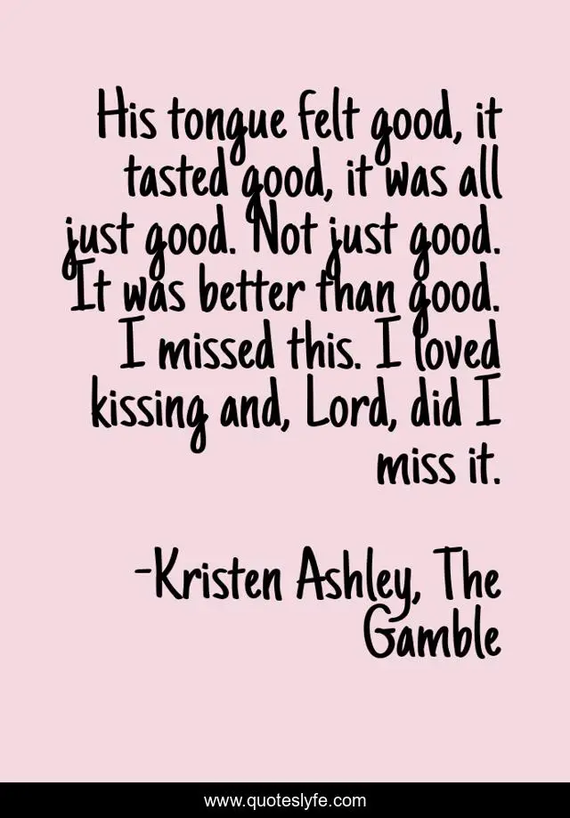 This page presents the quote "His tongue felt good, it tasted good, it was all just good. Not just good. It was better than good. I missed this. I loved kissing and, Lord, did I miss it.". Author of this quote is Kristen Ashley, The Gamble. .