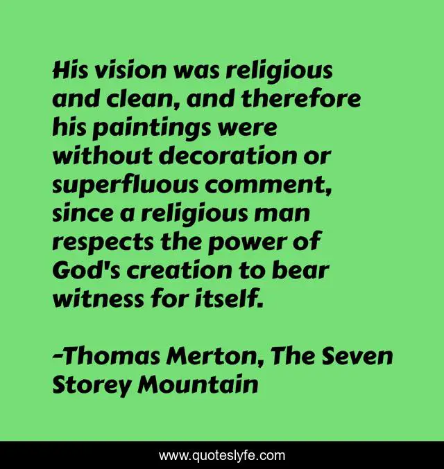 This page presents the quote "His vision was religious and clean, and therefore his paintings were without decoration or superfluous comment, since a religious man respects the power of God's creation to bear witness for itself.". Author of this quote is Thomas Merton, The Seven Storey Mountain. This quote is about god, creation, art,.