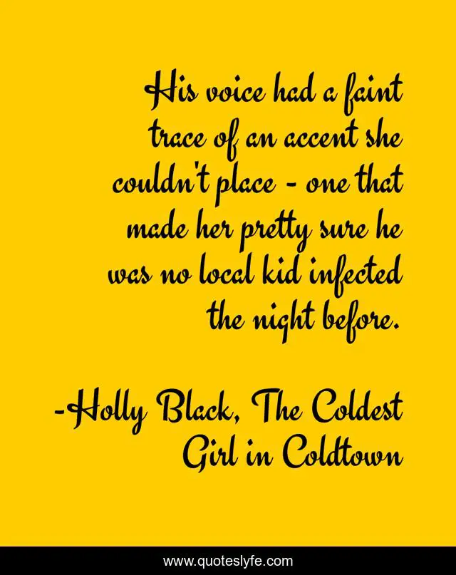 This page presents the quote "His voice had a faint trace of an accent she couldn't place - one that made her pretty sure he was no local kid infected the night before.". Author of this quote is Holly Black, The Coldest Girl in Coldtown. This quote is about beautiful, dark, literature, vampires, ya, the-coldest-girl-in-coldtown, gavriel, holly-black, romance,.