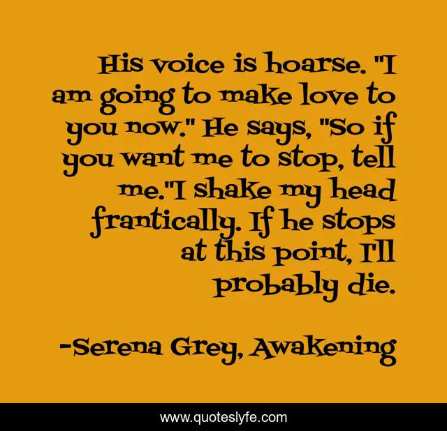 This page presents the quote "His voice is hoarse. "I am going to make love to you now." He says, "So if you want me to stop, tell me."I shake my head frantically. If he stops at this point, I'll probably die.". Author of this quote is Serena Grey, Awakening. .