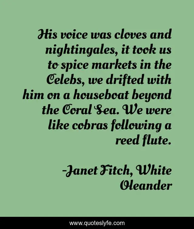"Janet Fitch, White Oleander Quotes." Quoteslyfe.com, 2025. Fri. 05 Dec. 2025. <https://www.quoteslyfe.com/quote/His-voice-was-cloves-and-nightingales-it-257816>.