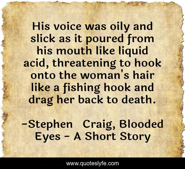 This page presents the quote "His voice was oily and slick as it poured from his mouth like liquid acid, threatening to hook onto the woman's hair like a fishing hook and drag her back to death.". Author of this quote is Stephen Craig, Blooded Eyes - A Short Story. This quote is about disturbing, horror, death, blood, killer,.