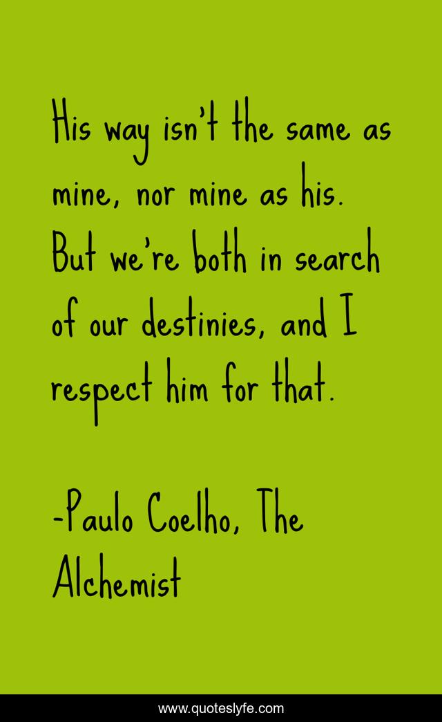 This page presents the quote "His way isn't the same as mine, nor mine as his. But we're both in search of our destinies, and I respect him for that.". Author of this quote is Paulo Coelho, The Alchemist. This quote is about path, respecting-others, destinies,.