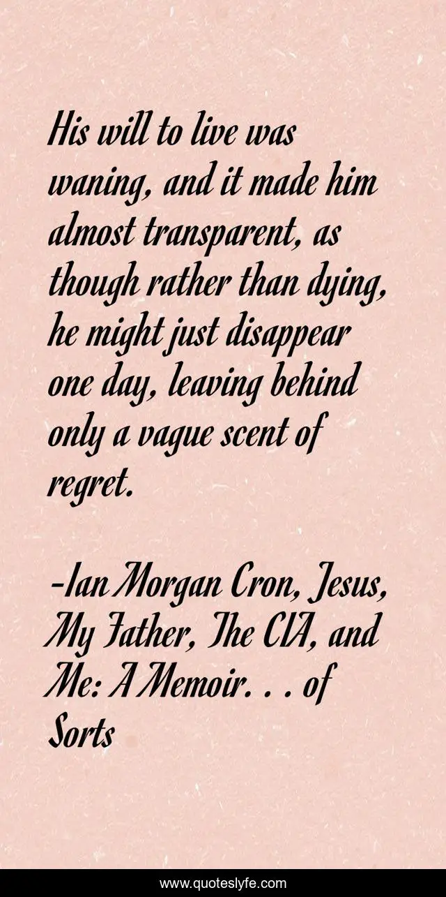 This page presents the quote "His will to live was waning, and it made him almost transparent, as though rather than dying, he might just disappear one day, leaving behind only a vague scent of regret.". Author of this quote is Ian Morgan Cron, Jesus, My Father, The CIA, and Me: A Memoir. . . of Sorts. This quote is about life, death,.