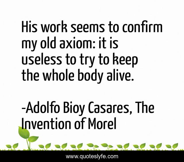 This page presents the quote "His work seems to confirm my old axiom: it is useless to try to keep the whole body alive.". Author of this quote is Adolfo Bioy Casares, The Invention of Morel. This quote is about science, the-body, axioms,.