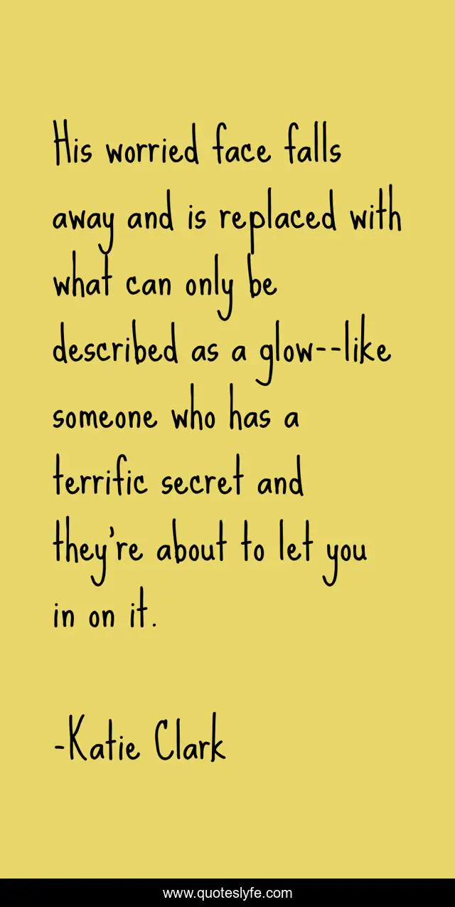 This page presents the quote "His worried face falls away and is replaced with what can only be described as a glow--like someone who has a terrific secret and they're about to let you in on it.". Author of this quote is Katie Clark. This quote is about secret, glow,.