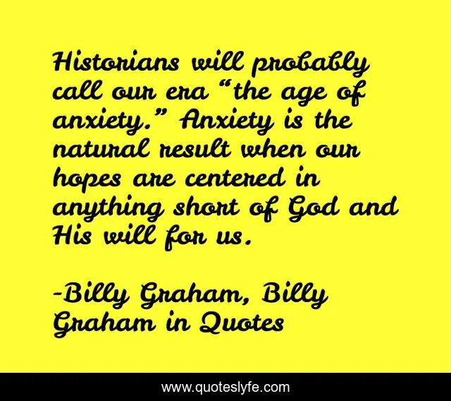 This page presents the quote "Historians will probably call our era “the age of anxiety.” Anxiety is the natural result when our hopes are centered in anything short of God and His will for us.". Author of this quote is Billy Graham, Billy Graham in Quotes. This quote is about anxiety, billy-graham,.