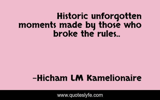 This page presents the quote "Historic unforgotten moments made by those who broke the rules..اللحظات التاريخية التي لا تنسى صنعت من قبل أولئك الذين كسروا القوانين". Author of this quote is Hicham LM Kamelionaire. This quote is about confidence, positive, motivational, optimistic, inspirational, enthusiasm,.
