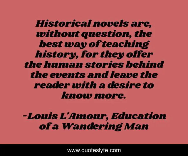 This page presents the quote "Historical novels are, without question, the best way of teaching history, for they offer the human stories behind the events and leave the reader with a desire to know more.". Author of this quote is Louis L'Amour, Education of a Wandering Man. This quote is about reading, books, historical-fiction, history,.