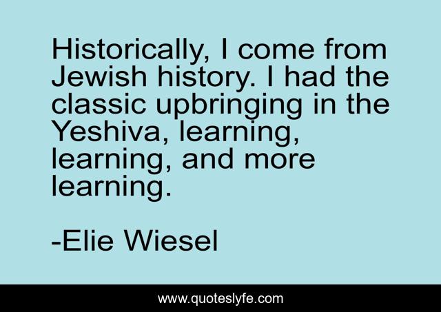 This page presents the quote "Historically, I come from Jewish history. I had the classic upbringing in the Yeshiva, learning, learning, and more learning.". Author of this quote is Elie Wiesel. This quote is about jewish, history, classic,.