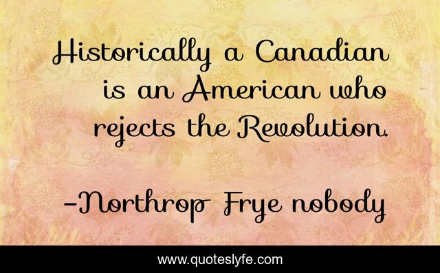 This page presents the quote "Historically a Canadian is an American who rejects the Revolution.". Author of this quote is Northrop Frye nobody. This quote is about canada, canadians,.