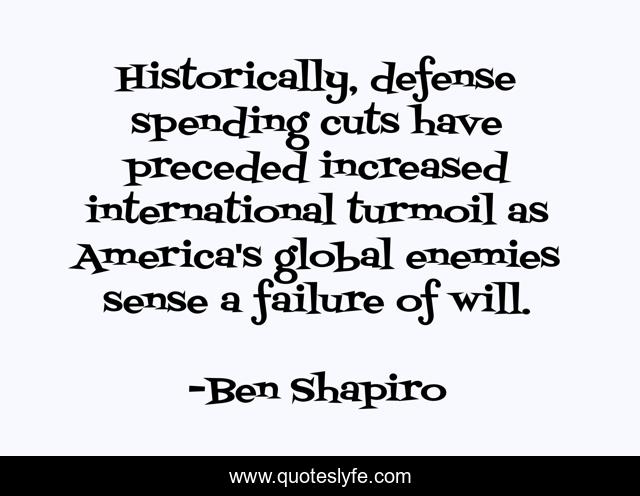 This page presents the quote "Historically, defense spending cuts have preceded increased international turmoil as America's global enemies sense a failure of will.". Author of this quote is Ben Shapiro. This quote is about turmoil, america,.