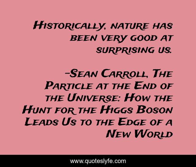 This page presents the quote "Historically, nature has been very good at surprising us.". Author of this quote is Sean Carroll, The Particle at the End of the Universe: How the Hunt for the Higgs Boson Leads Us to the Edge of a New World. This quote is about surprise, nature,.
