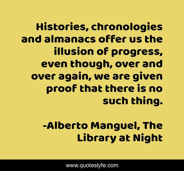 This page presents the quote "Histories, chronologies and almanacs offer us the illusion of progress, even though, over and over again, we are given proof that there is no such thing.". Author of this quote is Alberto Manguel, The Library at Night. This quote is about almanacs, progress, histories, chronologies,.