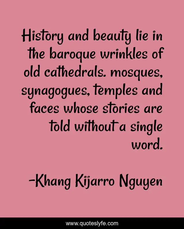 This page presents the quote "History and beauty lie in the baroque wrinkles of old cathedrals. mosques, synagogues, temples and faces whose stories are told without a single word.". Author of this quote is Khang Kijarro Nguyen. This quote is about temples, beauty, synagogues, cathedrals, wrinkles, mosuqes, stories, faces, baroque,.