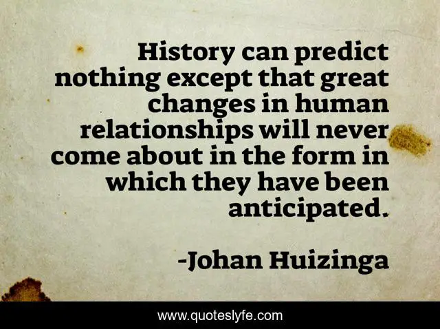 This page presents the quote "History can predict nothing except that great changes in human relationships will never come about in the form in which they have been anticipated.". Author of this quote is Johan Huizinga. This quote is about great, changes,.