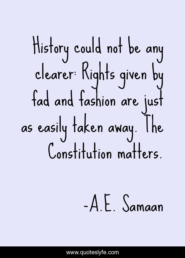 This page presents the quote "History could not be any clearer: Rights given by fad and fashion are just as easily taken away. The Constitution matters.". Author of this quote is A.E. Samaan. This quote is about individual-rights, liberty, bill-of-rights, constitutional-law, libertarian, civil-rights, constitutional-rights,.