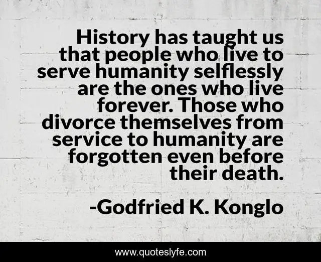 This page presents the quote "History has taught us that people who live to serve humanity selflessly are the ones who live forever. Those who divorce themselves from service to humanity are forgotten even before their death.". Author of this quote is Godfried K. Konglo. .