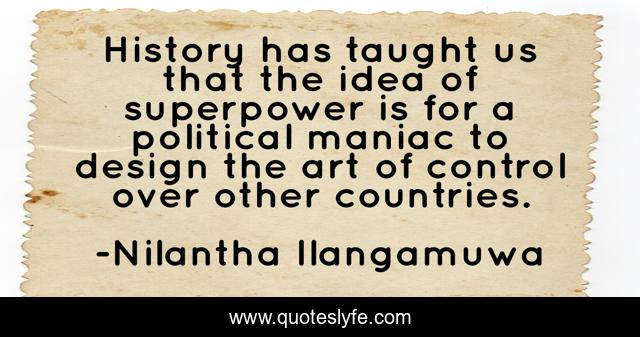 This page presents the quote "History has taught us that the idea of superpower is for a political maniac to design the art of control over other countries.". Author of this quote is Nilantha Ilangamuwa. This quote is about history, political, international-relations,.