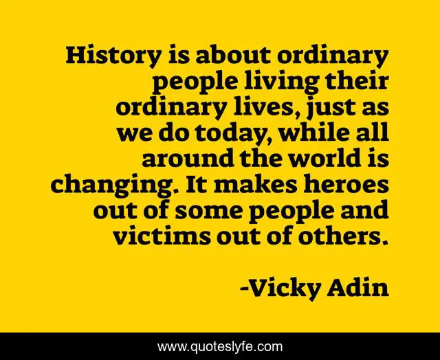 This page presents the quote "History is about ordinary people living their ordinary lives, just as we do today, while all around the world is changing. It makes heroes out of some people and victims out of others.". Author of this quote is Vicky Adin. This quote is about family-life, life, romance-love-heartache, historical-fiction,.