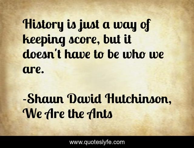 This page presents the quote "History is just a way of keeping score, but it doesn't have to be who we are.". Author of this quote is Shaun David Hutchinson, We Are the Ants. This quote is about teen, loss, life, death, love, space, ya, aliens, bullying,.