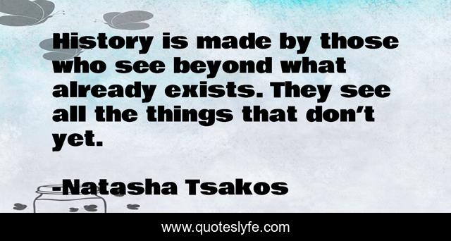 This page presents the quote "History is made by those who see beyond what already exists. They see all the things that don’t yet.". Author of this quote is Natasha Tsakos. This quote is about future, curiosity, innovation,.