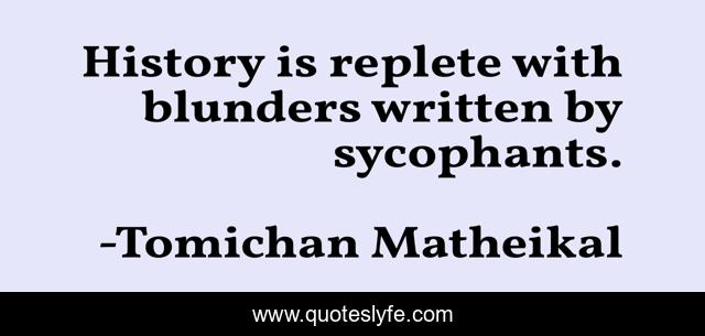 This page presents the quote "History is replete with blunders written by sycophants.". Author of this quote is Tomichan Matheikal. This quote is about lies, sycophants, truth, politics, history-as-a-lie, history,.
