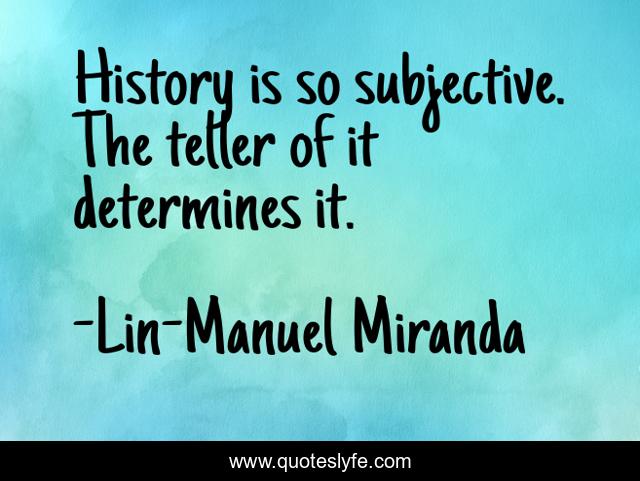 This page presents the quote "History is so subjective. The teller of it determines it.". Author of this quote is Lin-Manuel Miranda. This quote is about subjective, teller,.