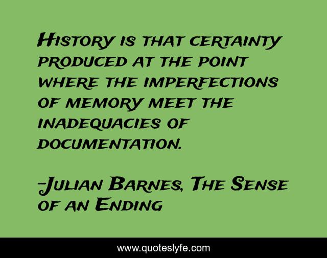 This page presents the quote "History is that certainty produced at the point where the imperfections of memory meet the inadequacies of documentation.". Author of this quote is Julian Barnes, The Sense of an Ending. .