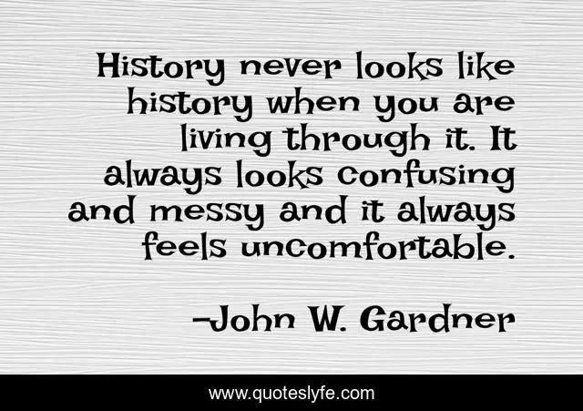 This page presents the quote "History never looks like history when you are living through it. It always looks confusing and messy and it always feels uncomfortable.". Author of this quote is John W. Gardner. This quote is about historians, history,.
