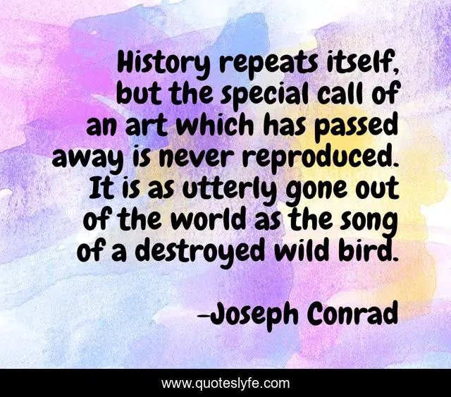 This page presents the quote "History repeats itself, but the special call of an art which has passed away is never reproduced. It is as utterly gone out of the world as the song of a destroyed wild bird.". Author of this quote is Joseph Conrad. This quote is about world, art, bird,.