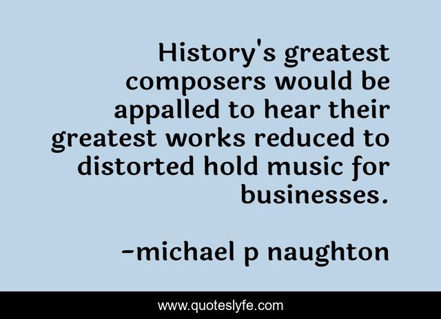 This page presents the quote "History's greatest composers would be appalled to hear their greatest works reduced to distorted hold music for businesses.". Author of this quote is michael p naughton. This quote is about composers, technological-progress, technology,.